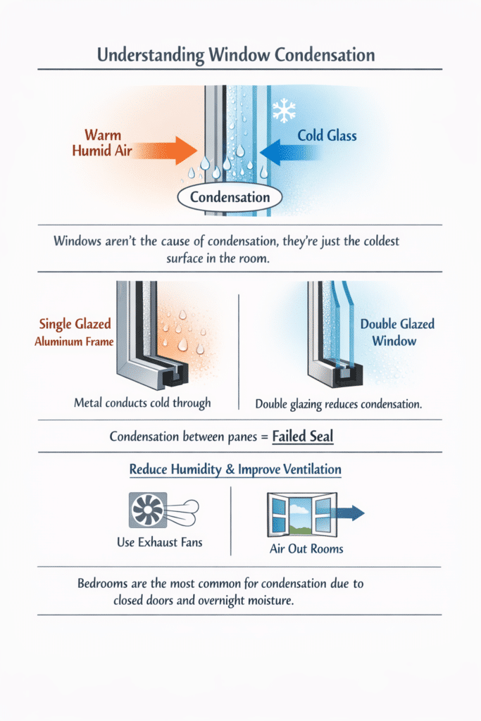 This is an important distinction because it changes how you approach the fix. Replacing windows might help, but if indoor humidity stays high, you will still see moisture appearing on other cold surfaces, walls, corners, and ceiling edges.