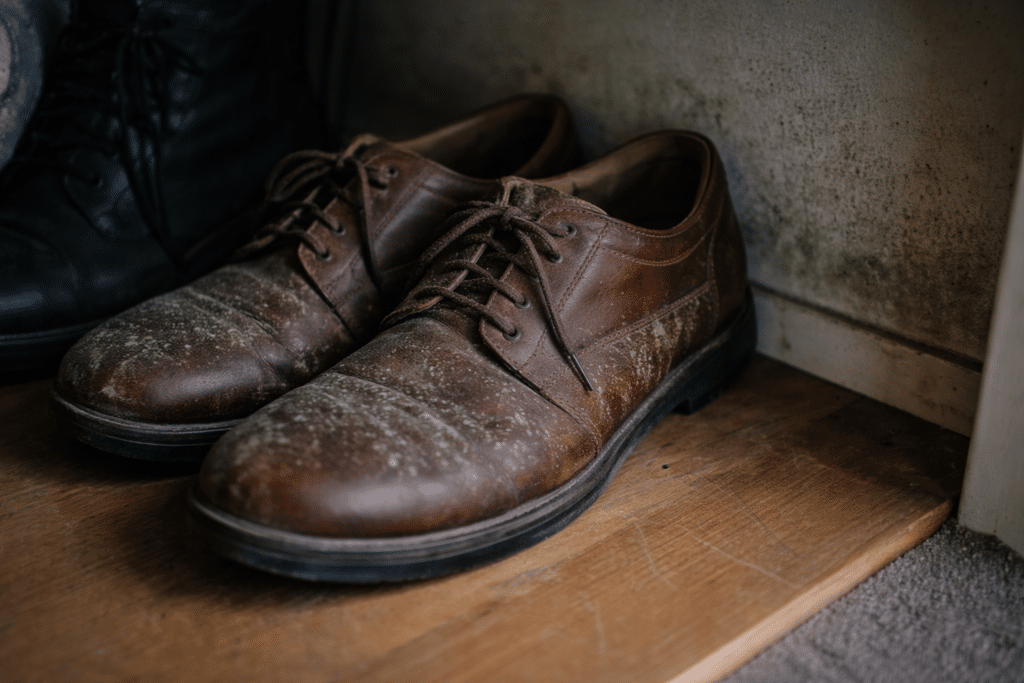 Clothing stored in damp wardrobes can develop mould, especially items pushed to the back where airflow is minimal. Leather shoes and bags are particularly vulnerable because leather absorbs moisture readily and mould establishes on the surface quickly in humid conditions.