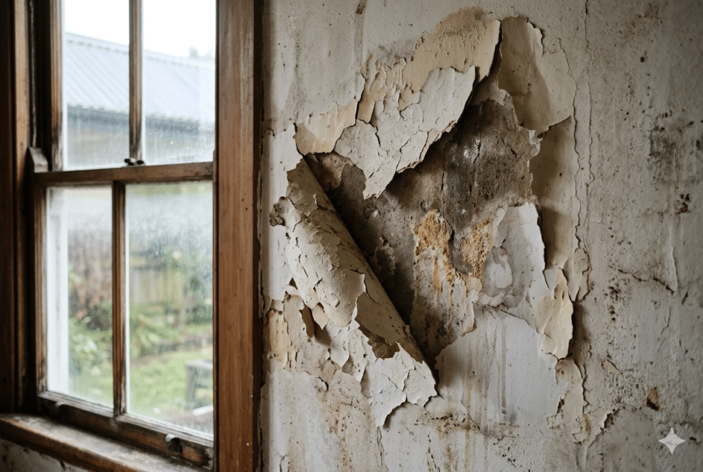 - Persistent moisture causes paint to peel, wallpaper to lift, and plaster to soften and crumble